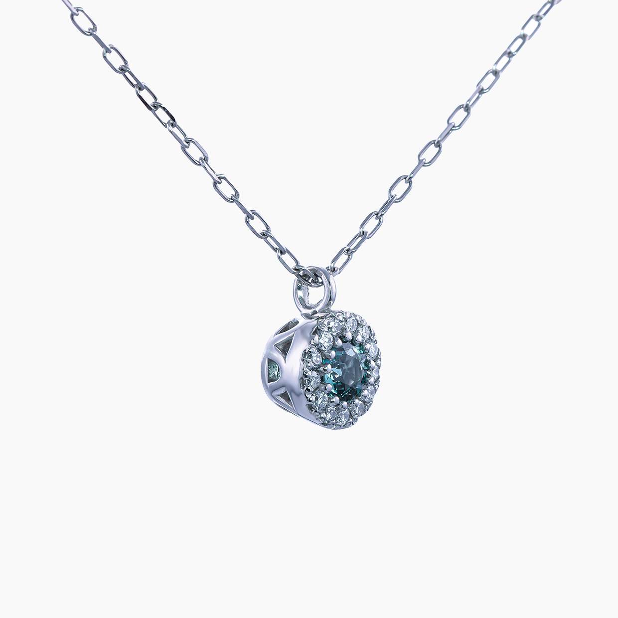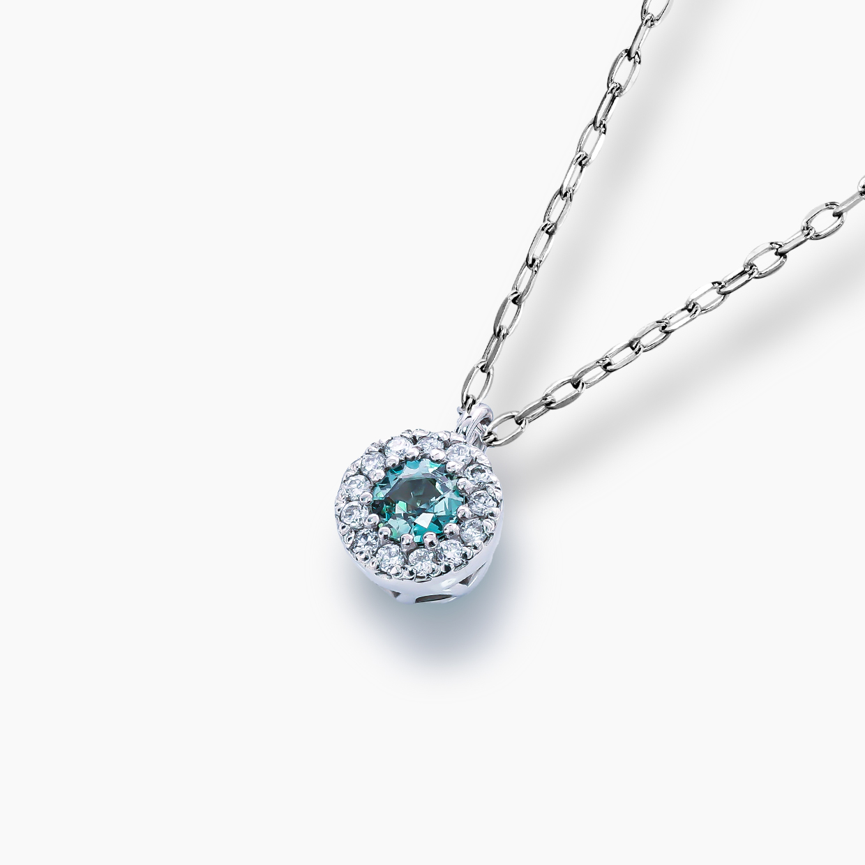 光によって表情を変える希少なアレキサンドライトをセンターに、まばゆい輝きのダイヤモンド13石で取り巻いた気品あふれるネックレスです。石座の高さは4mm、直径5mmとほどよい存在感で胸元を彩ります。繊細なチェーンがアレキサンドライトの神秘的な輝きを一層引き立て、身につけるたびに心を満たしてくれます。