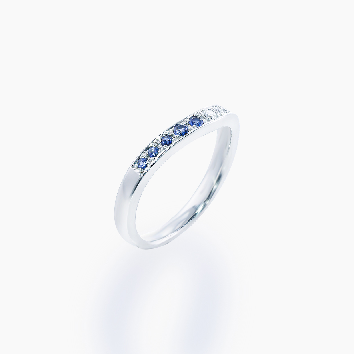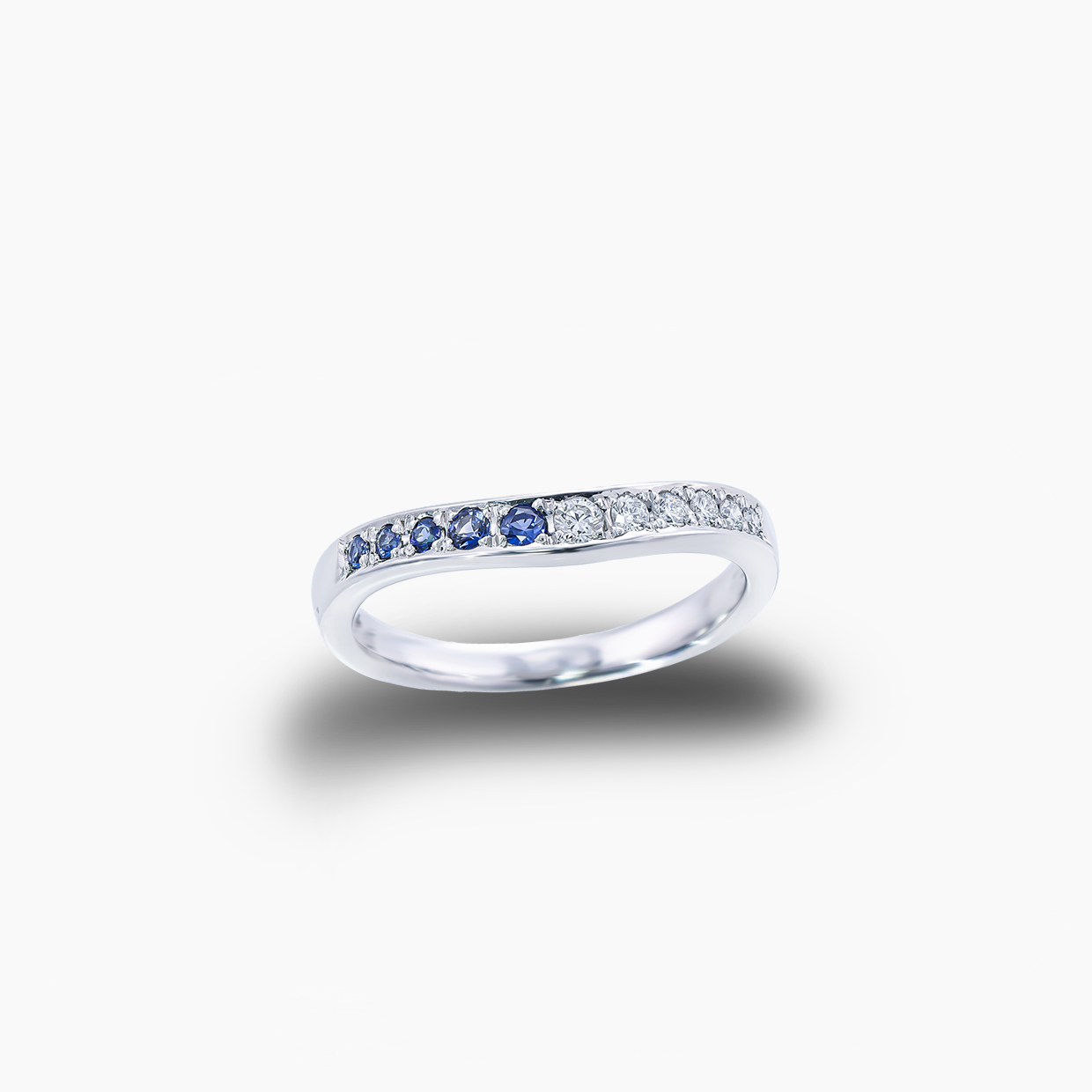 一方に鮮やかなサファイア、もう一方には煌めくダイヤモンドを配した、アシンメトリーなハーフエタニティリングです。緩やかなカーブを描くフォルムに沿って宝石が並び、手元にさりげない個性を添えます。サファイアは知恵や誠実さを象徴する9月の誕生石。その深いブルーは心を落ち着かせ、品格と知性を与えるとされます。一方、ダイヤモンドの純粋な輝きはサファイアを引き立て、洗練されたエレガンスを演出します。指に沿うように設計された緩やかなカーブラインは、快適な着け心地と指を長く美しく見せる効果を持ちます。シンプルでありながらデザイン性に富み、単体でも重ね着けでもお楽しみいただけます。決まった枠にとらわれない自由な輝きを表現したこのリングが、あなたの毎日に特別な彩りを添えてくれるでしょう。