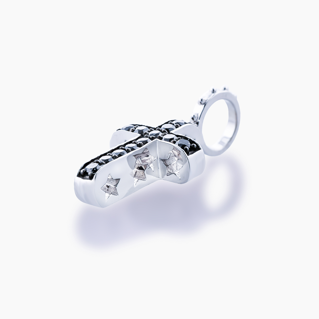 留具のところから、クロスの下まで約2cmという小さめサイズのペンダントです。しかし、大きめのバチカンは、太目のチェーンも楽々通る仕様ですので、男性も女性もお使いいただけます。小さいながらも厚みを持たせたペンダントには星が5個抜かれていて、隠れお洒落となっています。