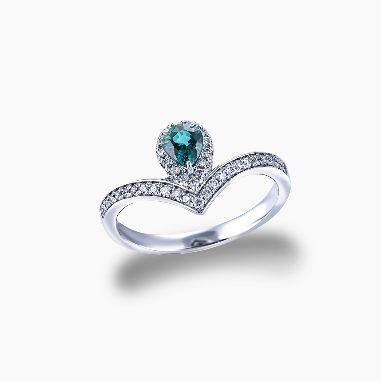 グランディディエライトのカラーは「Teal blue」と呼ばれ、ティールブルーのティールは鴨の羽色に近い青緑色のことです。硬さはエメラルドと同等の7.5でデリケートな宝石ですが、希少性が高く季節を選ばない所が人気です。そんな希少なグランディディエライトをリングでお楽しみください。