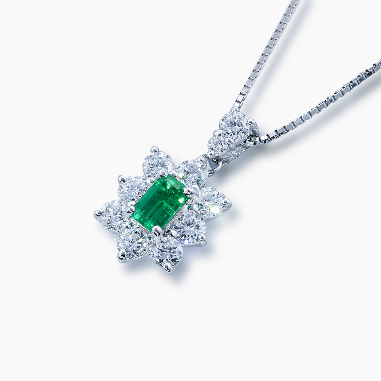 ブルーグリーンの神秘的で美しい彩り、そして石の内部から放たれる柔らかな煌めきが、見る人の心を捉えるエメラルド。そのエメラルドグリーンは、生命力に満ちた豊かな緑を映し出し、目に優しく、心地よいリラックス感をもたらします。深い緑が持つ落ち着きとエレガンスが絶妙に調和し、身につける人に特別な魅力を与える色です。メインのエメラルドは、0.48ctの美しいブルーグリーンが印象的で、その色の移ろいと優雅なきらめきが、どこか幻想的でありながら力強さも感じさせます。存在感のあるエメラルドを引き立てるため、脇石には輝きの強い少し大きめのメレーダイヤモンドを配置し、華やかさとエレガントさを一層引き立てています。シンプルでありながら、その中に華やかさとエレガントな気品を宿すペンダント。まるで自然の美しさを身に纏うような、洗練された輝きが魅力的なペンダントです。